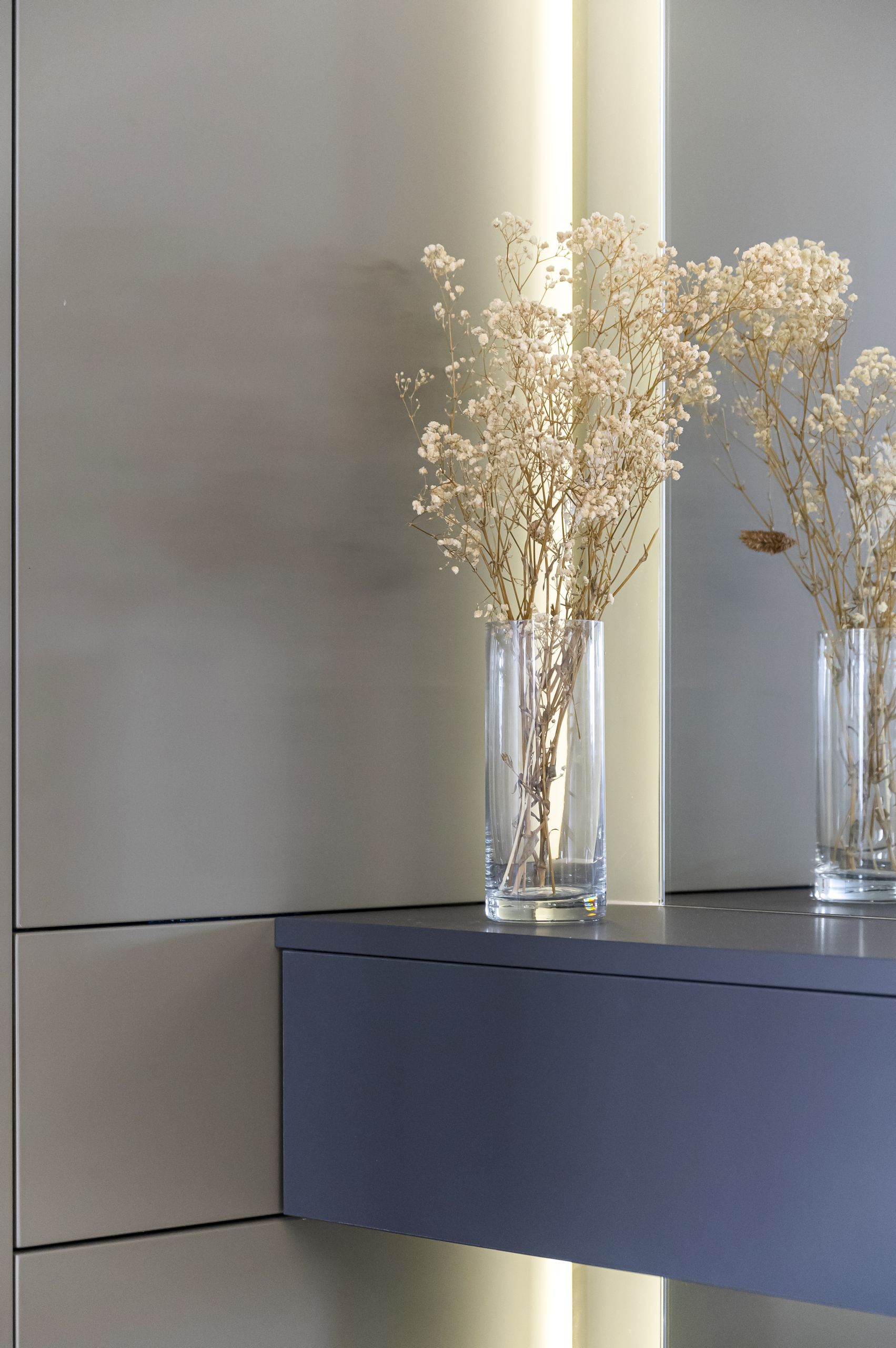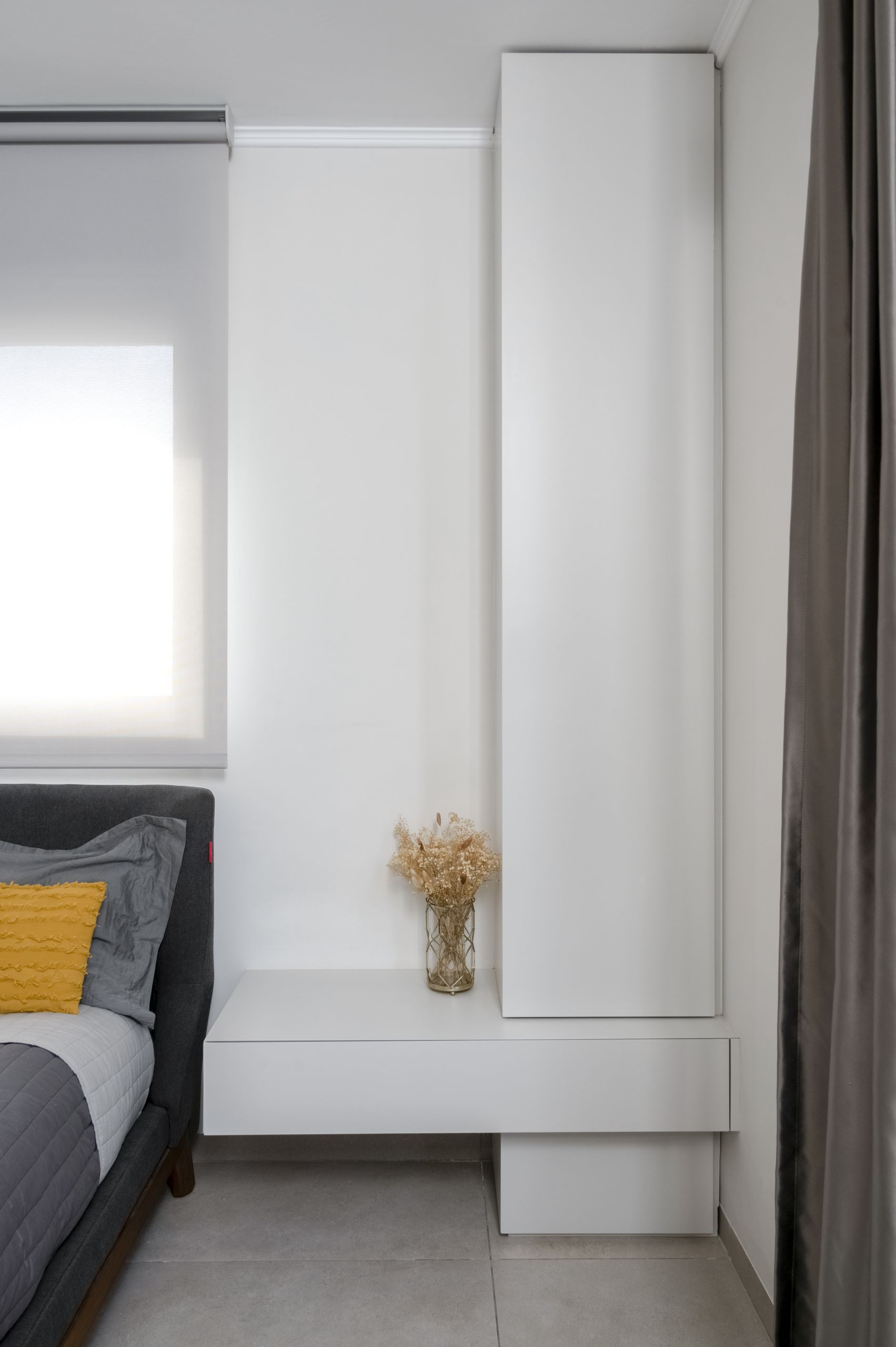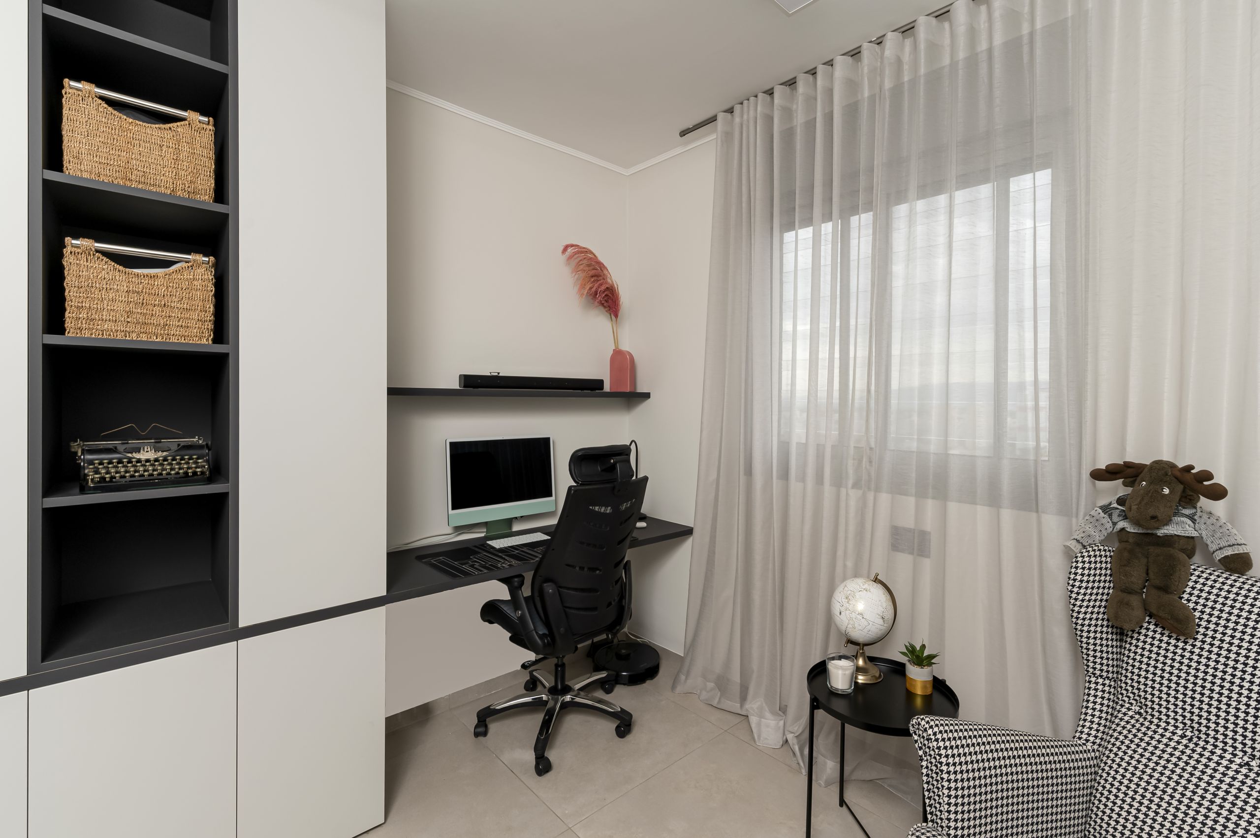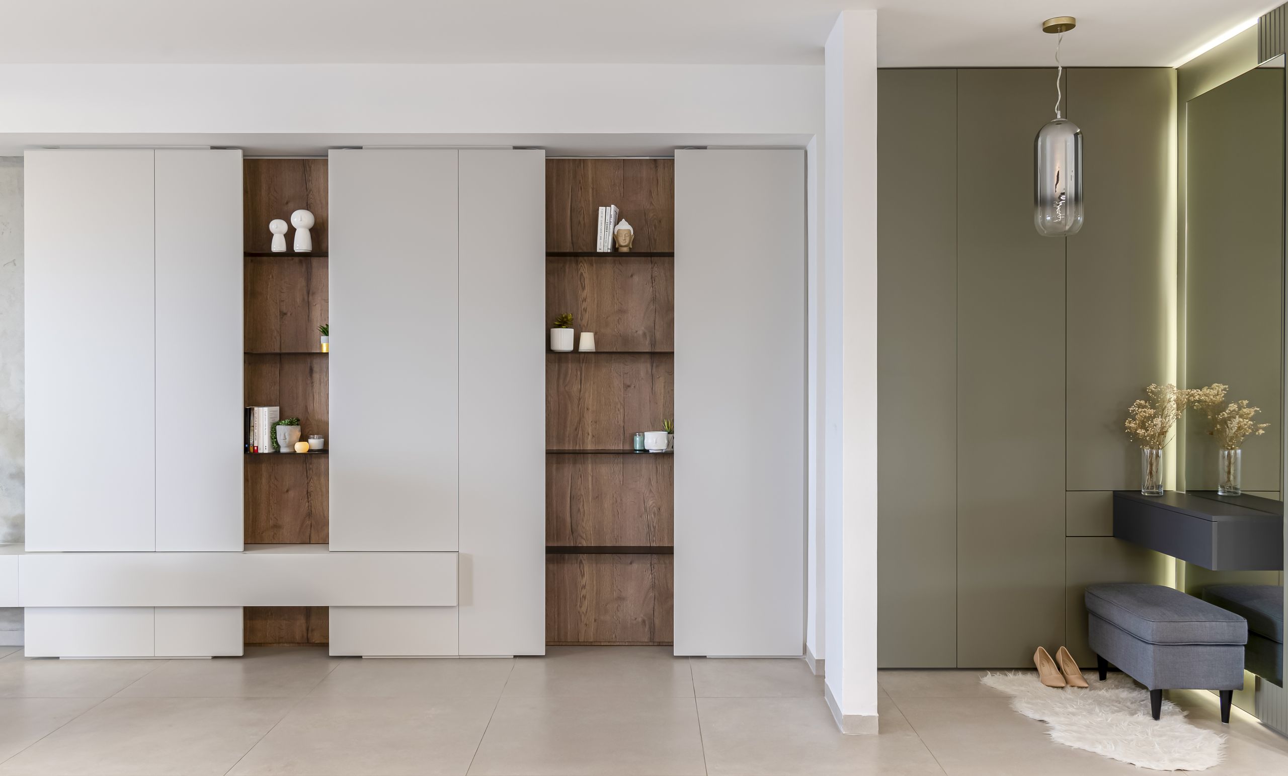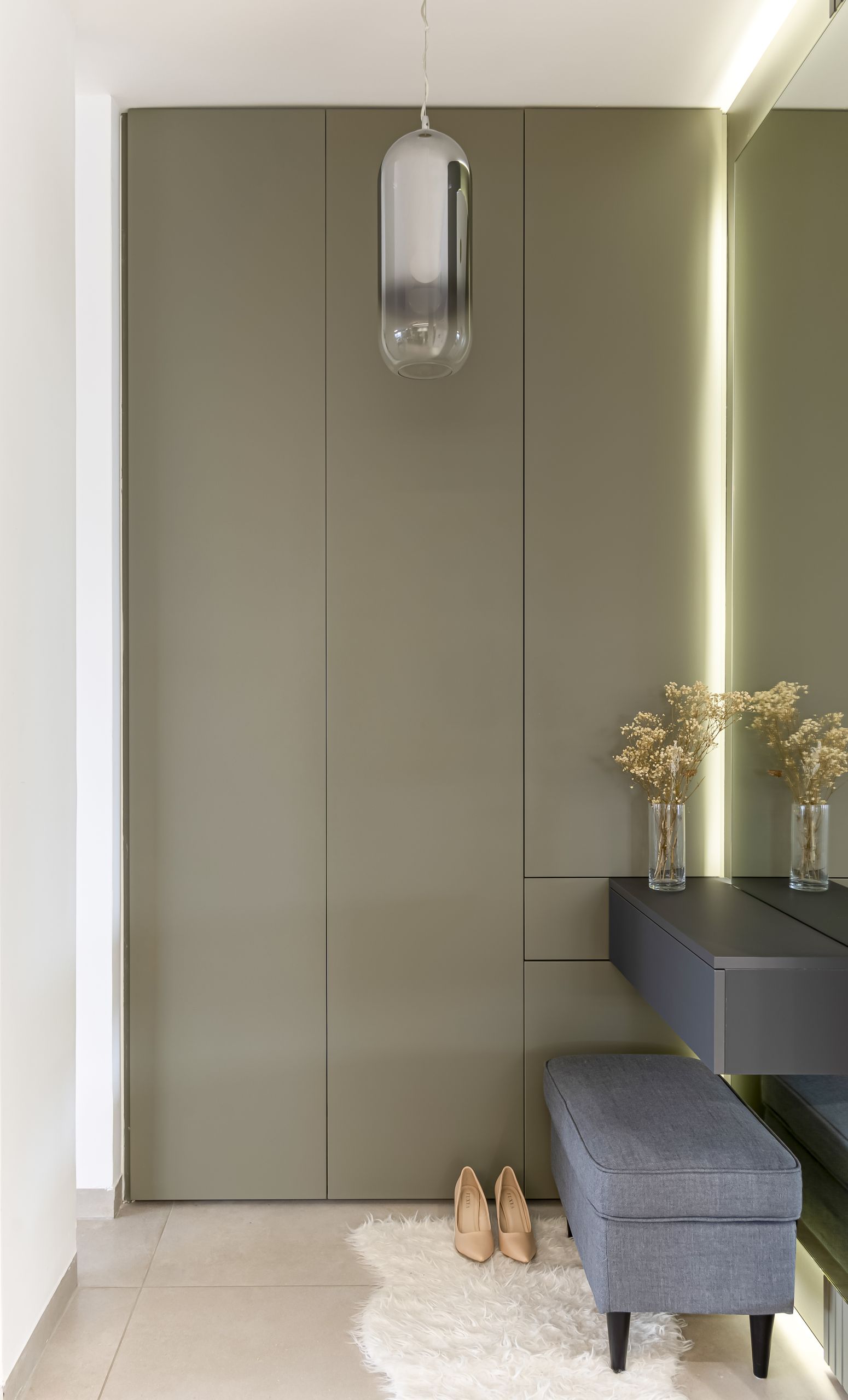 הבית תוכנן עבור זוג בגיל השלישי, בסגנון מודרני, אלגנטי ומינימליסטי ובשילוב פתרונות איחסון רבים. הגוון הירוק אהוב על בעלת הבית ונבחר כגוון מוביל לנגרות. איזור הכניסה קיבל ארון למעילים, תיקים, נעליים ומגירה למפתחות ודואר, מראה גדולה ומוארת וחיפוי קיר מחורץ.