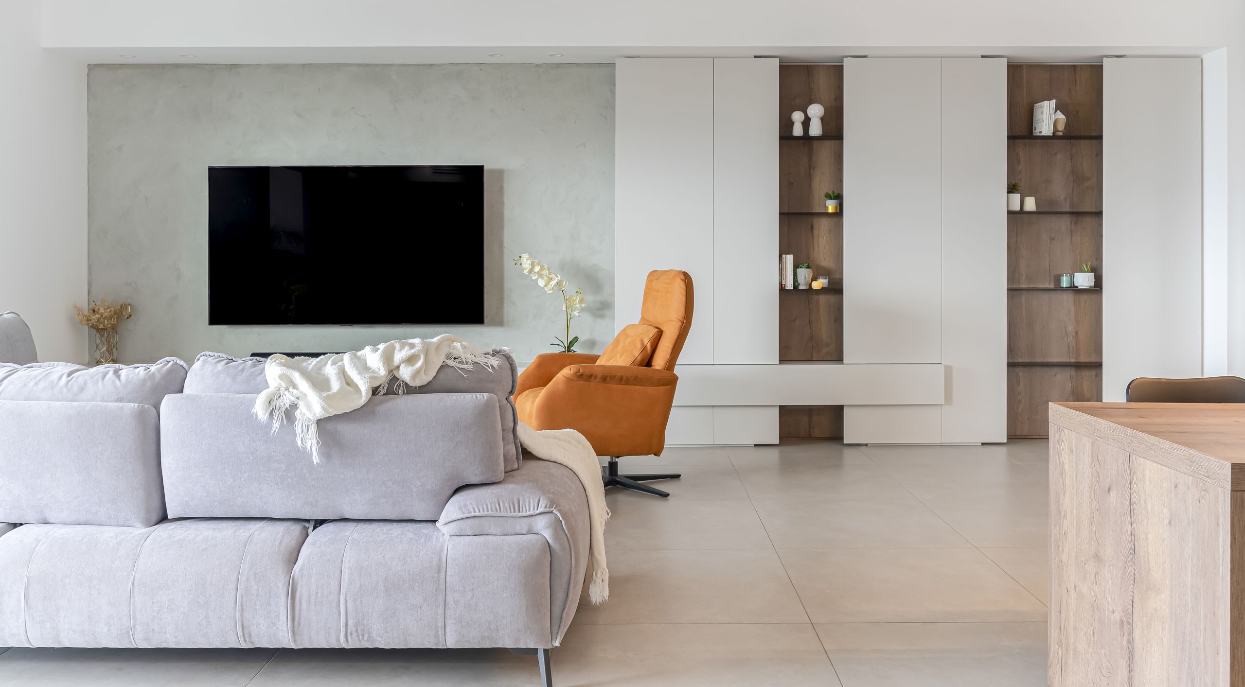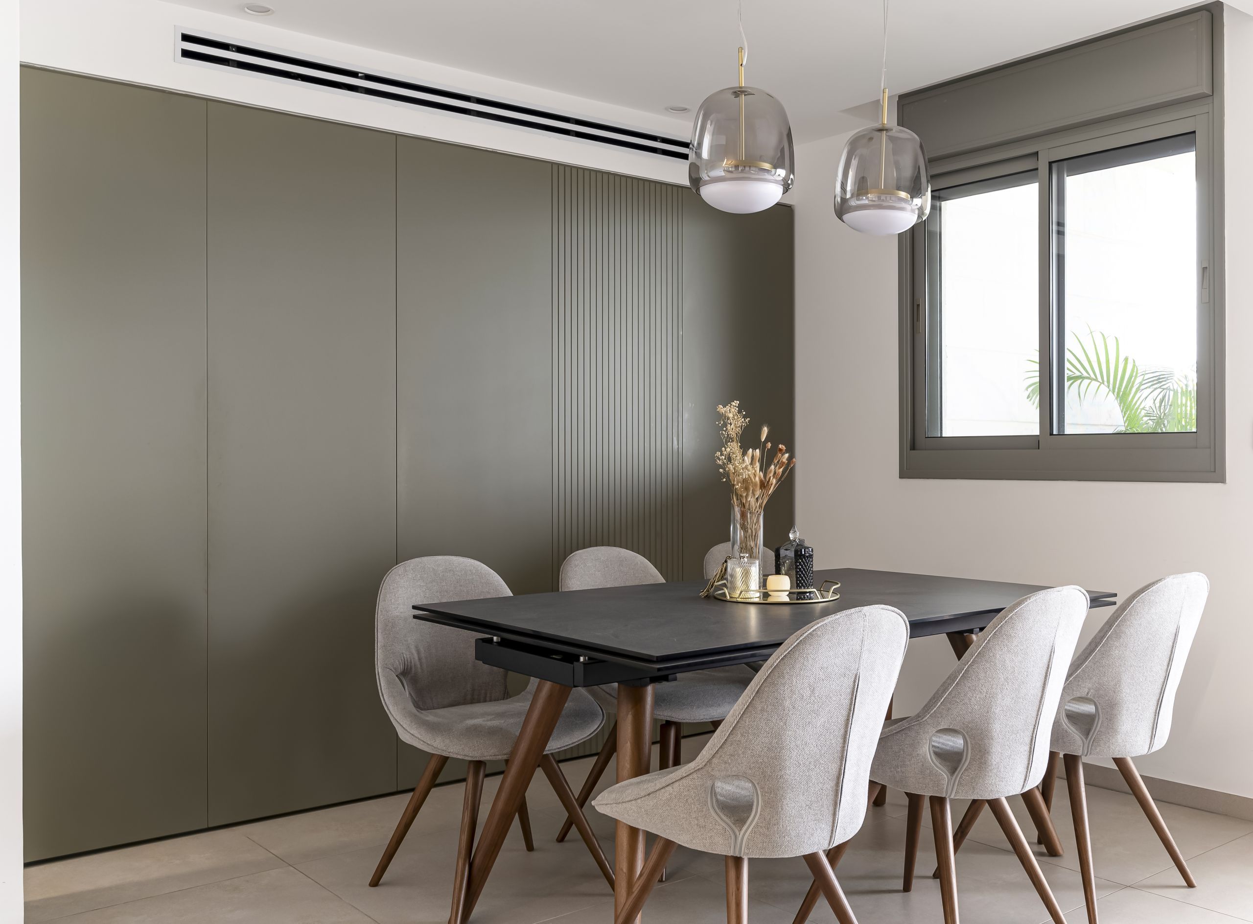 בסלון עיצבנו קיר נגרות באורך 7 מטרים שתוכנן עד הפרט האחרון ובפינת האוכל ארון קיר גדול בגוון שמבליט את השולחן ונותן לו רקע. דלת אחת קיבלה חירוץ כקריצה לעיצוב הכניסה.